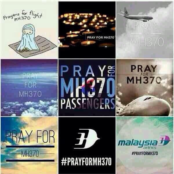| Trong khi hàng triệu người đang dõi theo việc tìm kiếm máy bay Malaysia mất tích thì cộng đồng mạng cũng đã thể hiện tấm lòng của mình với việc đăng tải hình ảnh cầu nguyện cho phi hành đoàn. Một bức ảnh bầu trời vàng rực với câu "Pray for MH370" (cầu nguyện cho MH370) được thành viên Watafak đăng tải lên Twitter. |