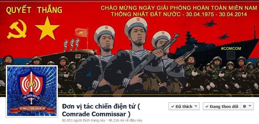 | Trên trang fanpage chính thức của đơn vị tác chiến điện tử (Comrade Commissar) cũng đã đổi hình nền nhân dịp kỷ niệm ngày giải phóng đất nước 30/4 với hình ảnh lực lượng hải quân luôn sẵn sàng chiến đấu. Fanpage này nhanh chóng thu hút hơn 80.000 thành viên theo dõi. |