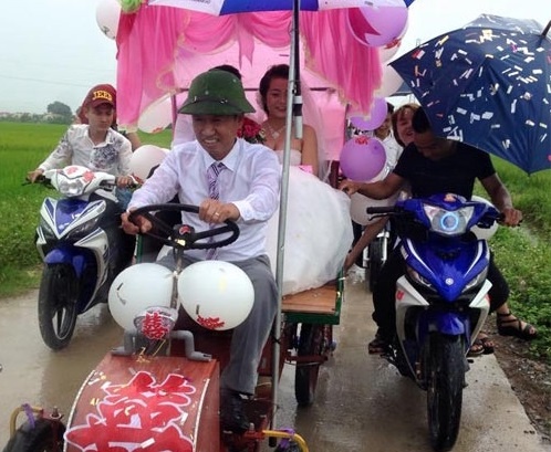 Cô dâu và chú rể cùng ngồi trên chiếc xe bốn bánh độc đáo, xung quanh được trang trí bóng bay và ruy băng màu hồng. Theo người đăng tải, đây là lễ cưới diễn ra ngày 31/7 của chú rể Anh Tuấn (sinh năm 1995) và cô dâu Vy Oanh (sinh năm 1996), đều tại Diễn Châu, Nghệ An. Ảnh: Việt Quang.