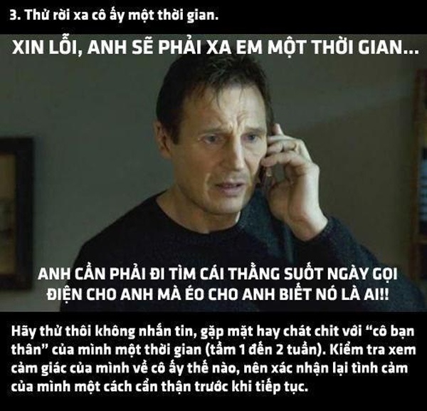 | Thử thách là điều mà bất kì tình yêu nào cũng cần. Hãy thử rời xa cô ấy một thời gian và bình tâm suy nghĩ về mối quan hệ đang theo đuổi và cách để cả hai bên xác định được tình cảm thật và sự quan trọng của đối phương trong cuộc sống. |
