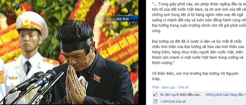 Kính gửi Chú Điện Biên, cùng toàn thể gia đình Đại tướng. Cháu là Trịnh Minh Hiếu, cháu ngoại Trung tướng Đặng Kinh. Ông cháu đã cùng Đại tướng nhiều phen sát cánh, vào sinh ra tử trong ba cuộc trường chinh. Cháu chưa được gặp Đại tướng, nhưng nhân duyên này, gia đình cháu, ông bà, mẹ cháu và các bác thì đều rất gần gũi và thân thiết với toàn thể gia đình đại tướng. Nay, cháu xin đươc gửi đến chú, bà Bích Hà, cùng toàn thể gia đình chú, những lời tiếc thương sâu sắc nhất. Một lần nữa, cháu xin được nghiêng mình kính cần, tiễn đưa Đại Tứớng về nơi an nghỉ cuối cùng. Vậy là, giờ, ông đã có thể về với quê hương, với đồng bào, đồng đội, và Bác Hồ. (Thành viên Trịnh Minh Hiếu).