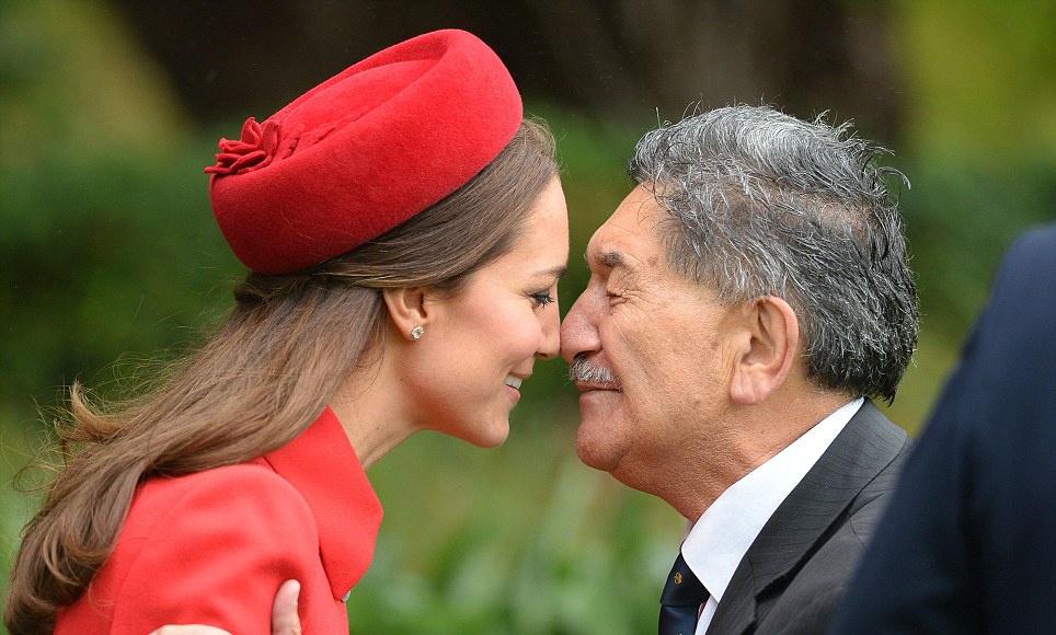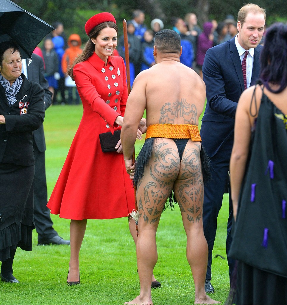| Một chiến binh Maori trong trang phục truyền thống bắt tay Công nương Kate tại tòa nhà chính phủ ở thủ đô của New Zealand. Ảnh: REX. |
