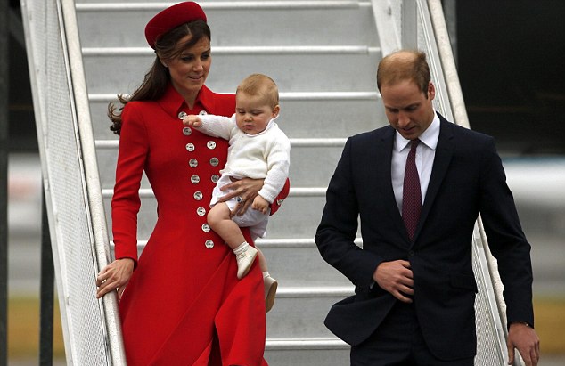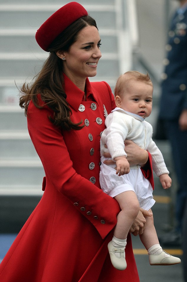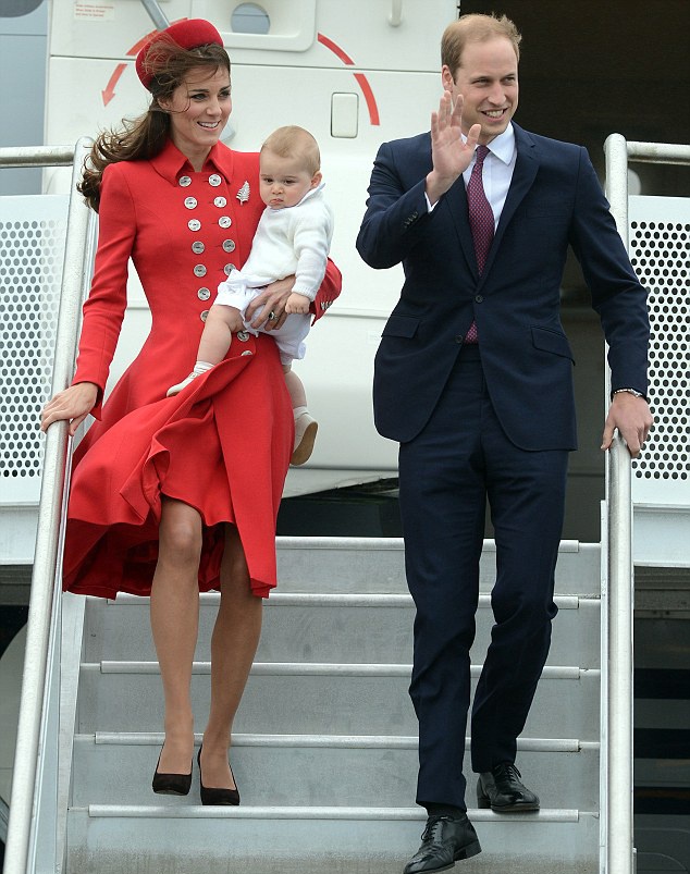 | Công nương Kate bế Hoàng tử George cùng chồng đáp xuống sân bay tại Wellington, thủ đô của New Zealand hôm 6/4. Đây là chuyến công du đầu tiên của Hoàng tử George, vị vua tương lai của nước Anh. Ảnh: Reuters. |