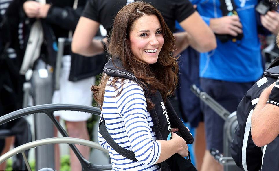 | Bà mẹ một con tươi cười trước cuộc đua. Vợ chồng Hoàng tử William mang theo Hoàng tử George trong chuyến công du Australia và New Zealand lần này. Ảnh: Getty. |