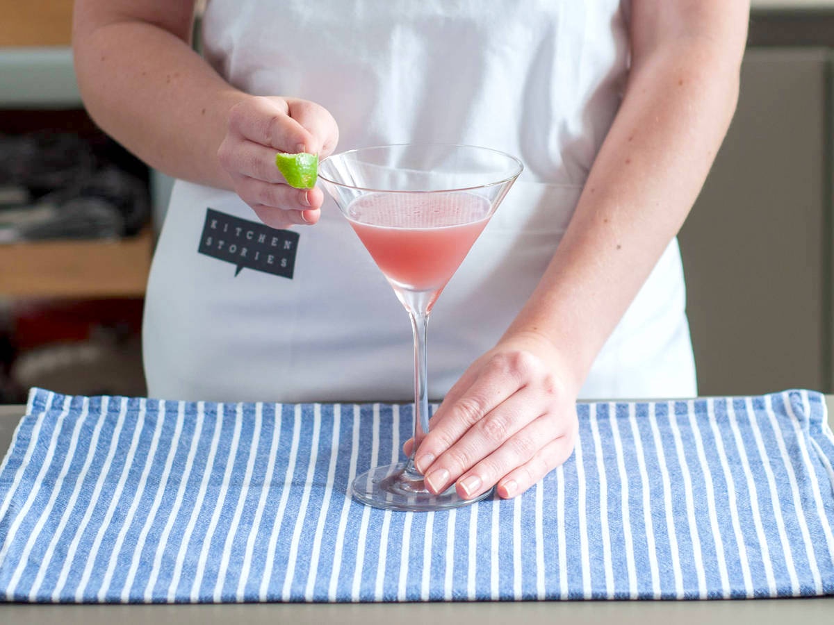 - Đổ cocktail vào ly martini và dùng vỏ chanh để trang trí là hoàn thành.