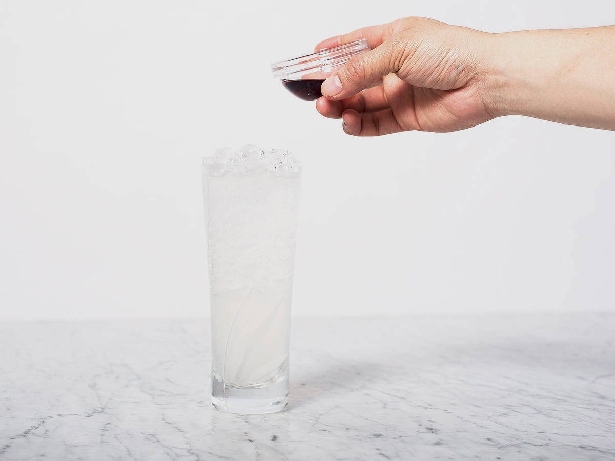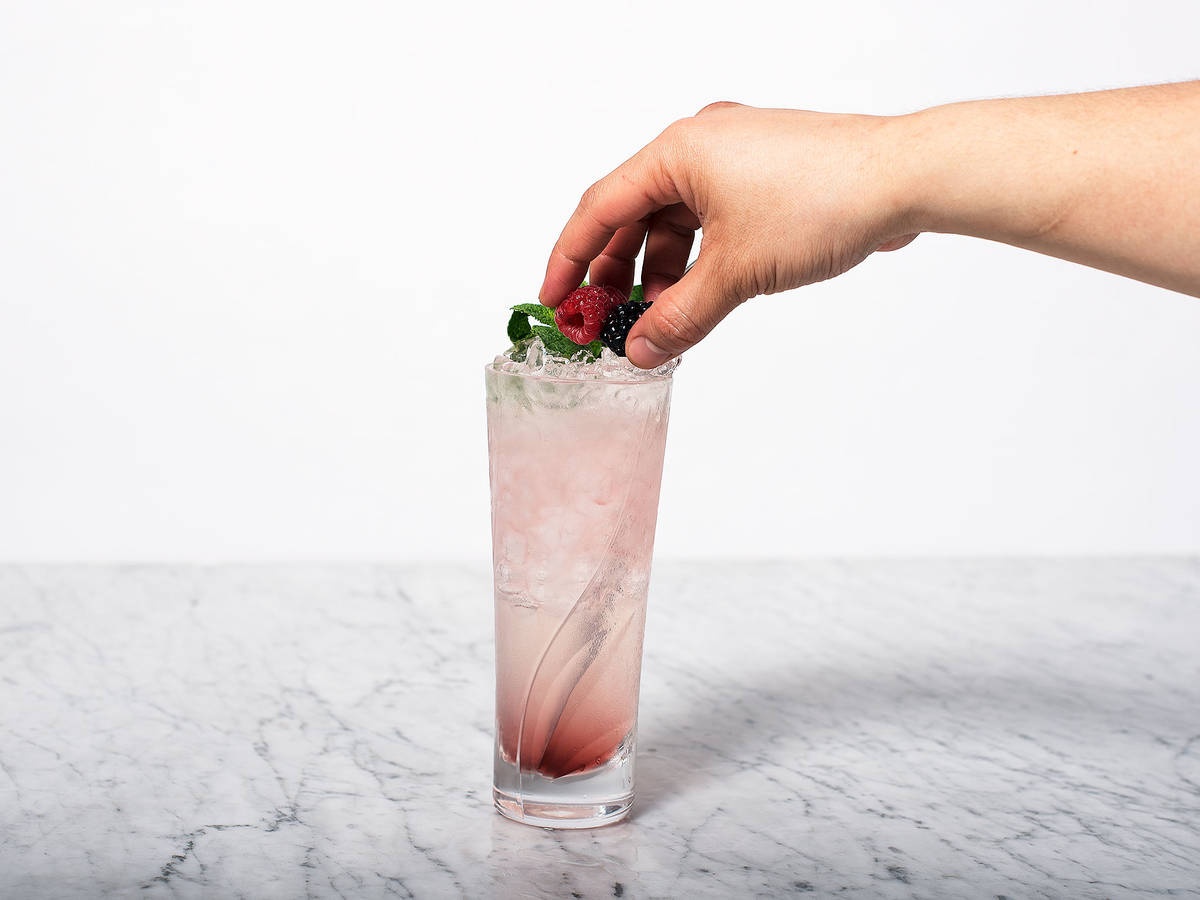 - Cho tất cả các nguyên liệu (trừ rượu mùi mâm xôi) vào ly cao.