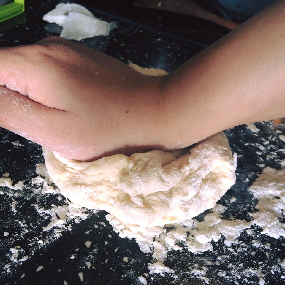 - Sau khi bột đã nở gấp đôi thì dùng mu bàn tay để “đấm” nhẹ hay ép nhẹ cho khí trong khối bột thoát ra ngoài. Lấy bột ra, nhào bằng tay lại sơ qua trong khoảng 1-2 phút.