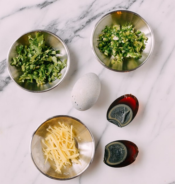 | Trong khi đang đun cháo, tranh thủ thái gừng và cắt trứng bắc thảo để riêng. |