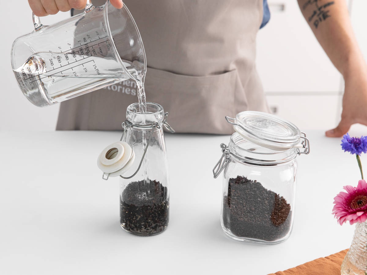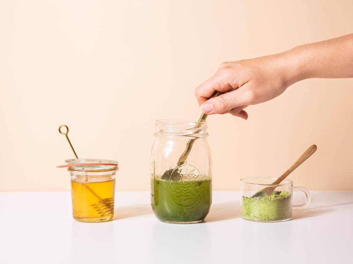 - Cho bột matcha và nước vào lọ thủy tinh. Khuấy đều, sau đó thêm mật ong và khuấy một lần nữa.