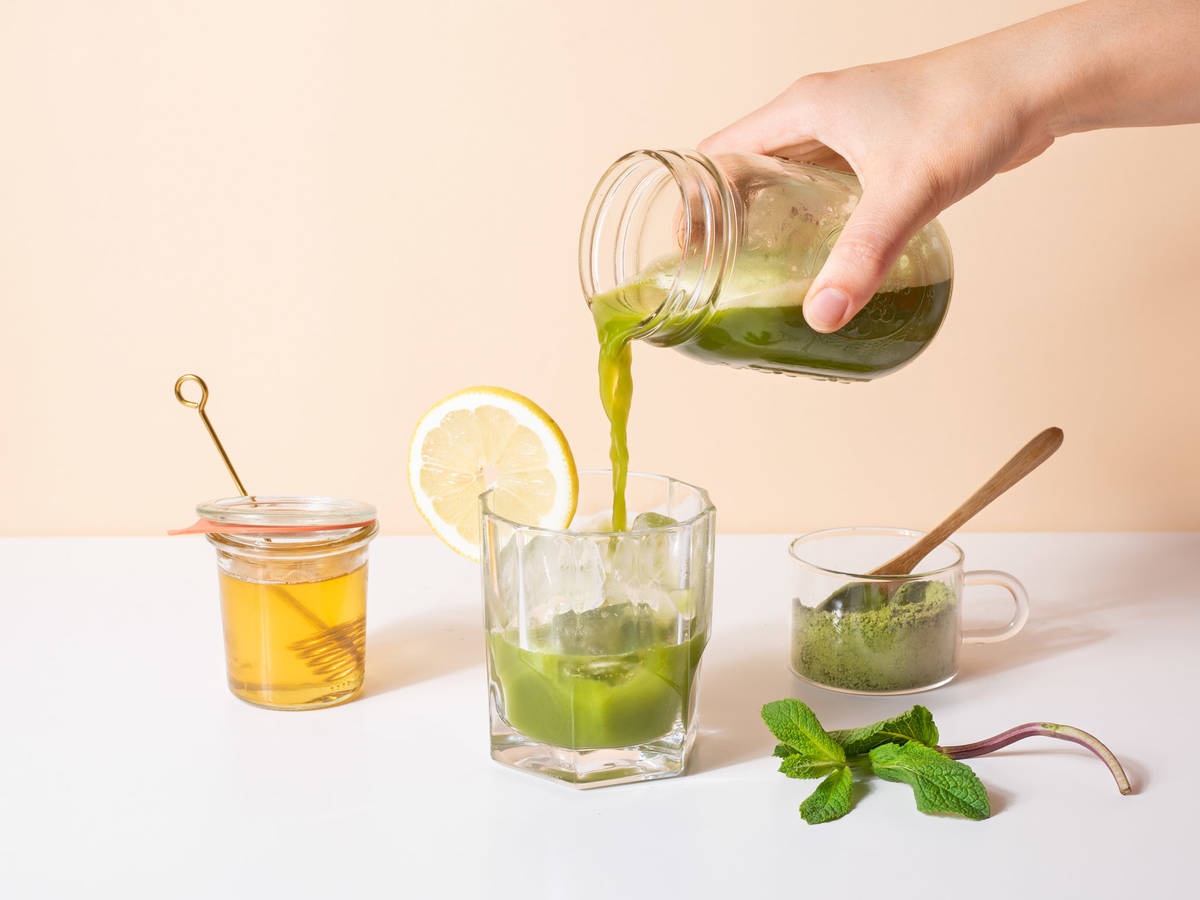 - Đổ hỗn hợp matcha đã pha ở bước 1 vào ly và trang trí với chanh cùng lá bạc hà rồi thưởng thức.