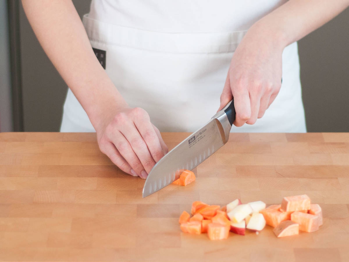 - Cắt khoai lang, táo và cà rốt thành miếng vừa ăn.