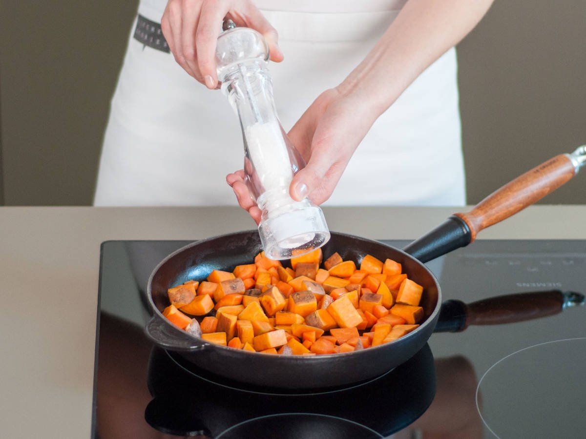- Áp chảo khoai lang trên lửa vừa khoảng 6-10 phút đến khi chín vàng và mềm.