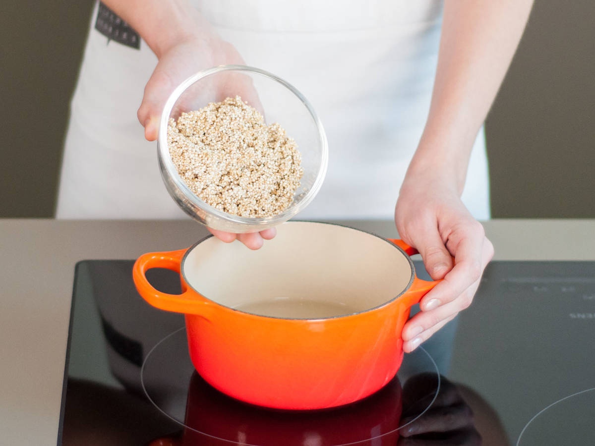 - Rửa sạch hạt diêm mạch dưới nước và cho vào nồi với nước muối, rồi đun sôi. Sau đó, đậy nắp và giảm mức nhiệt xuống thấp.