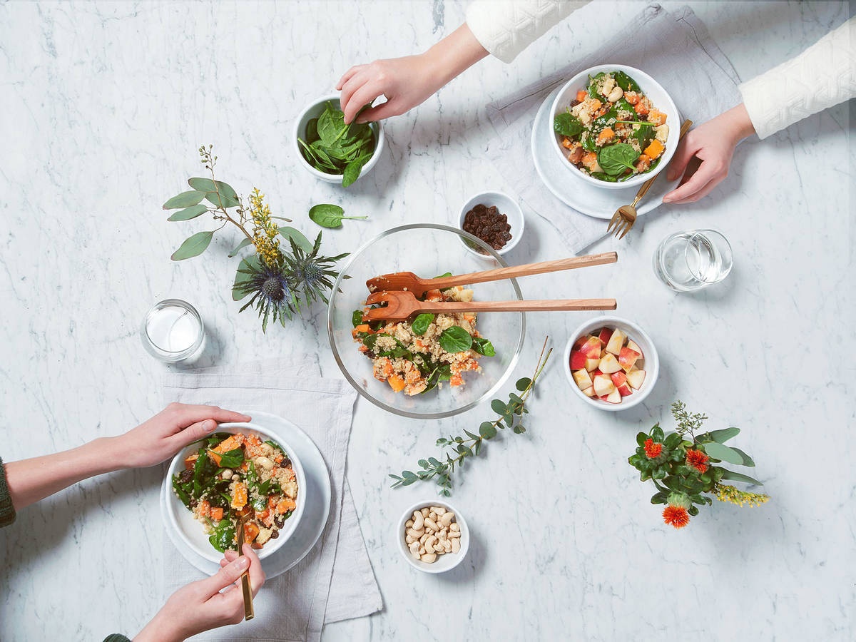 - Cho khoai lang, táo, cà rốt, rau chân vịt, nho khô và hạt điều vào tô lớn.