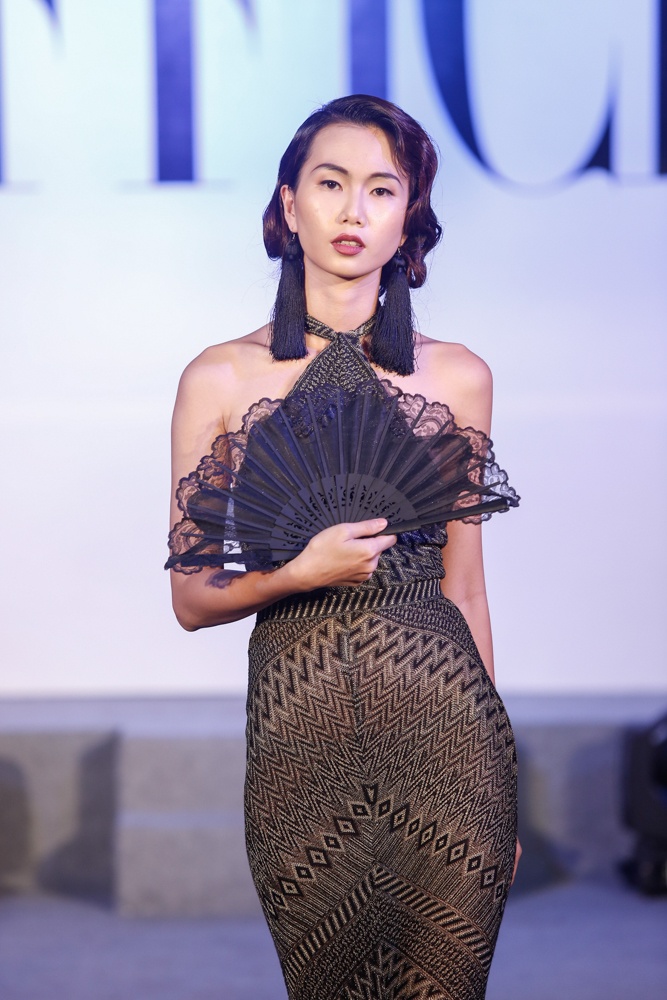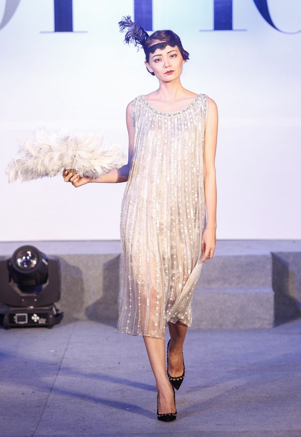 Người mẫu Hoàng Oanh trình diễn bộ cánh đặc trưng ở thập niên 1920. Lúc này, corset ôm sát được thay thế bằng váy suông thoải mái nhằm nhấn mạnh sự tự do, độc lập của người phụ nữ. Hình ảnh nổi bật ở giai đoạn này là những "cô nàng Flapper" hiện đại, nổi loạn và liều lĩnh. Phụ nữ thích thể hiện mình với mái tóc ngắn, diện đầm hạ eo.