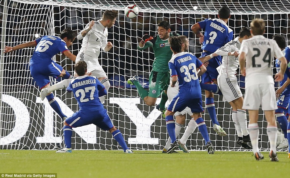| Người hâm mộ Real không phải đợi lâu để chứng kiến bàn thắng mở tỷ số. Phút 15, trung vệ lên tham gia tấn công Sergio Ramos đánh đầu dũng mãnh làm tung lưới Cruz Azul sau cú đá phạt của Toni Kroos bên cánh phải. |