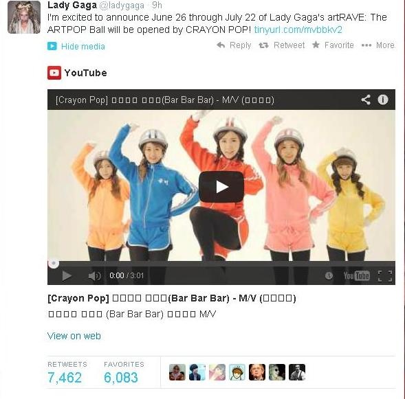 Crayon Pop sẽ có cơ hội trình diễn trên sân khấu của Gaga ở các thành phố Mỹ và Canada từ 26/6 và 22/7, như Boston, Chicago, Houston, Dallas, Toronto, Montreal... Gaga cũng đăng tải MV gây sốt Bar Bar Bar của Crayon Pop trên Twitter cá nhân.