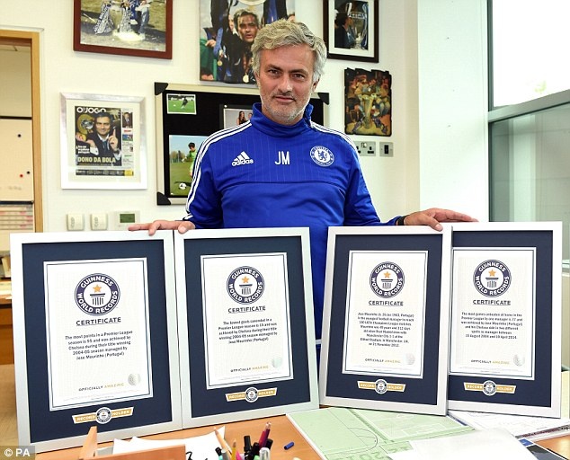 | Jose Mourinho là chủ nhân của 4 giải gồm: Huấn luyện viên giành được nhiều điểm nhất tại Premier League (95 điểm, năm 2005); huấn luyện viên đoạt danh hiệu Champions League cùng nhiều đội bóng nhất (2 lần với Porto và Inter Milan); huấn luyện viên trẻ nhất cán mốc 100 trận tại Champions League (49 tuổi và 12 ngày); huấn luyện viên có số trận bất bại dài nhất trên sân nhà ở Premier League (77 trận). |