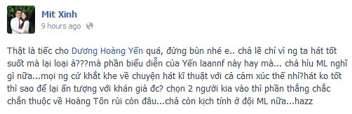 Nickname Mit Xinh viết: “Chả hiểu Mỹ Linh nghĩ gì nữa... mọi người cứ khắt khe về chuyện hát kỹ thuật với cả cảm xúc thế nhỉ? Hát không tốt thì sao để lại ấn tượng với khán giả được?
