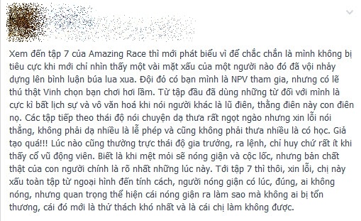 Đây là lỗi của Linh Chi khi cô sơ xuất để rơi mật thư tại nơi làm chổi, cô cũng đã tỏ vẻ rất hối hận và day dứt. Tuy nhiên, với tư cách là một đồng đội, Nhan Phúc Vinh lẽ ra có sự cảm thông và chia sẻ, thì anh lại càng “đay nghiến” khi nhắc đi nhắc lại rằng đây là lỗi của Linh Chi chứ không phải là chuyện xui xẻo.