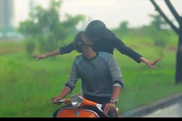 đội mũ bảo hiểm, lại khóa môi bạn trai trên xe máy khi xe đang chạy.