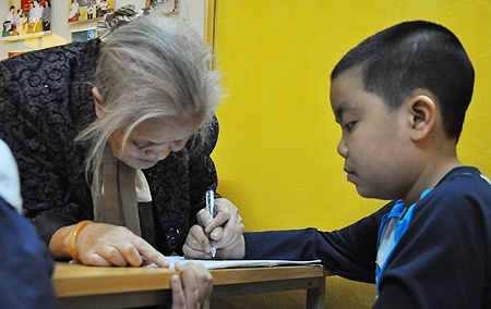 Lớp học không có bảng. Một buổi học, cụ giáo lưng còng xoay vần với những bài giảng từ lớp 1 đến lớp 5 với giáo án dành riêng cho từng cháu. 16 năm qua bà gần như chưa nghỉ dạy ở lớp học tình thương ngày nào. Cụ nói:"đến lớp thấy các con cặm cụi viết bài, làm toán, ê a đánh vần tôi mừng rơi nước mắt, quên cả mệt mỏi ốm đau".
