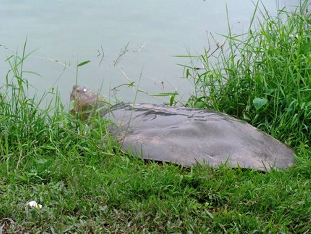 | Cụ rùa nằm ở bãi cỏ bên chân tháp Rùa. Đến khoảng 12h18 phút thì cụ rùa bắt đầu xuống hồ. |