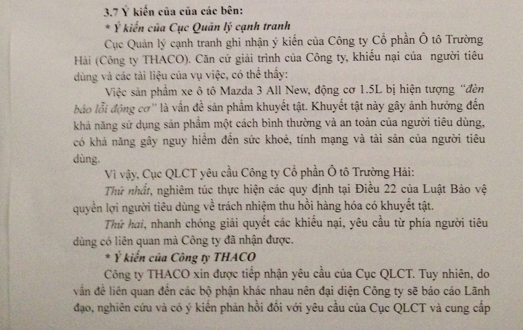Trong biên bản kết luận cuộc họp do ông Cao Xuân Quảng - đại diện Cục Quản lý cạnh tranh và ông Trần Vũ Sơn - đại diện công ty Trường Hải ký, Cục Quản lý cạnh tranh nêu rõ việc sản phẩm ôtô Mazda 3 All New bị hiện tượng đèn báo lỗi động cơ là sản phẩm khuyết tật. Khuyết tật này gây ảnh hưởng đến khả năng sử dụng sản phẩm một cách bình thường và an toàn của người tiêu dùng, có khả năng gây nguy hiểm đến sức khỏe, tính mạng và tài sản của người tiêu dùng.