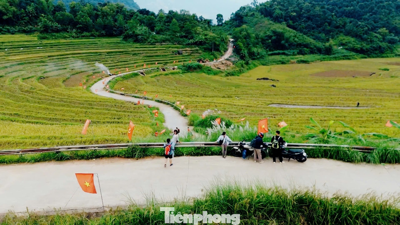 | Những lá cờ đỏ sao vàng thiêng liêng trở thành điểm nhấn giữa mùa vàng Pù Luông, chạm đến cảm xúc của nhiều du khách. |