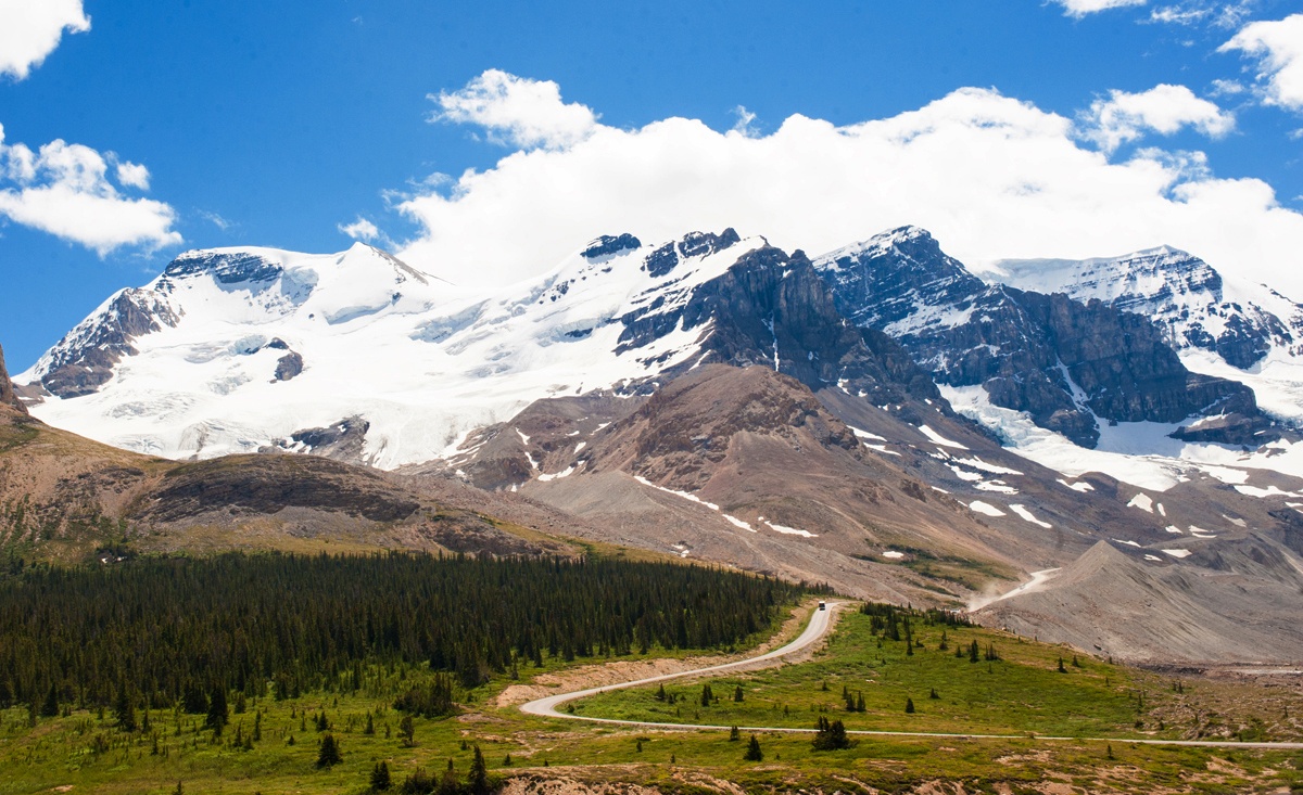 | Hai bên đường xuyên qua Công viên Quốc gia Banff đến khu Columbia Icefield và Công viên Quốc gia Jasper (Canada) là những đỉnh núi băng bao phủ đã hàng nghìn năm. |