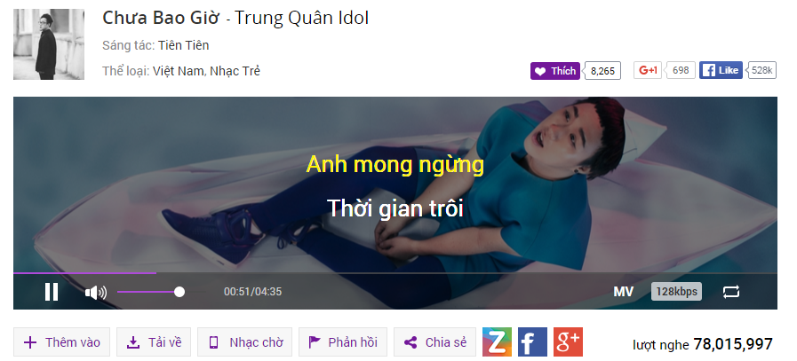 Vâng anh đi đi của Bùi Bích Phương có hơn 20 triệu lượt nghe, Chi Dân có 39 triệu với bản hit Làm vợ anh nhé. Mr. Siro với Vô hình trong tim em đạt trên 29 triệu. Bộ đôi Hồ Quang Hiếu – Hồ Việt Trung cũng có hơn 26 triệu với Em là của anh.