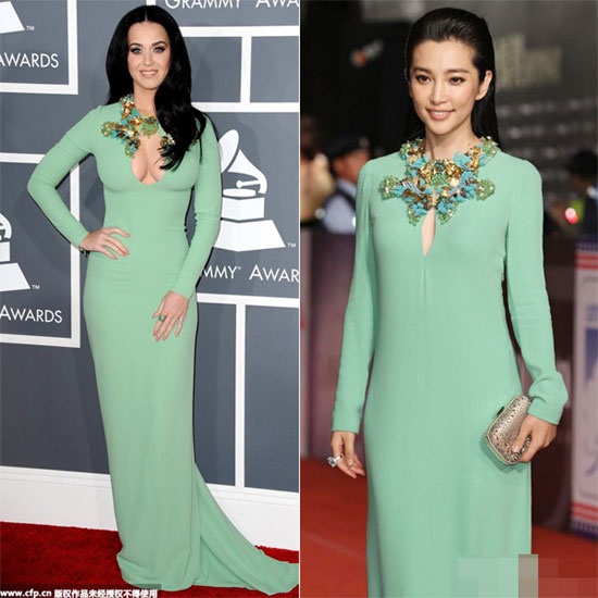 | Trong khi Katy Perry phô diễn vòng một căng tròn thì Lý Băng Băng cũng cuốn hút chẳng kém dù vòng một lép kẹp. |