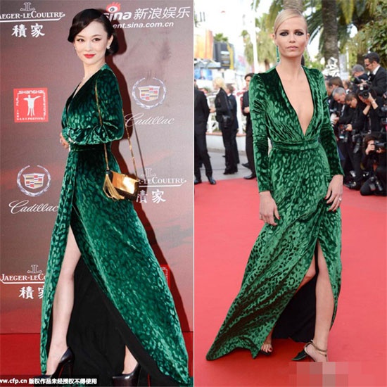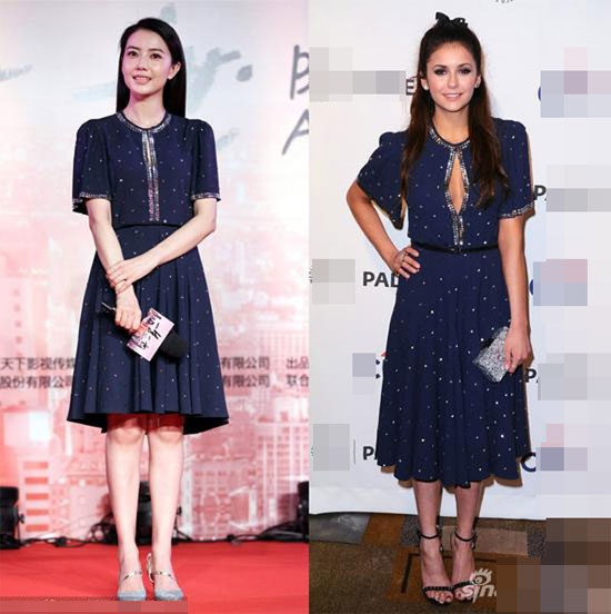 | Cao Viên Viên và Nina Dobrev mang hai phong cách khác biệt dù diện cùng chiếc váy xanh của hiệu Micheal Kors. |