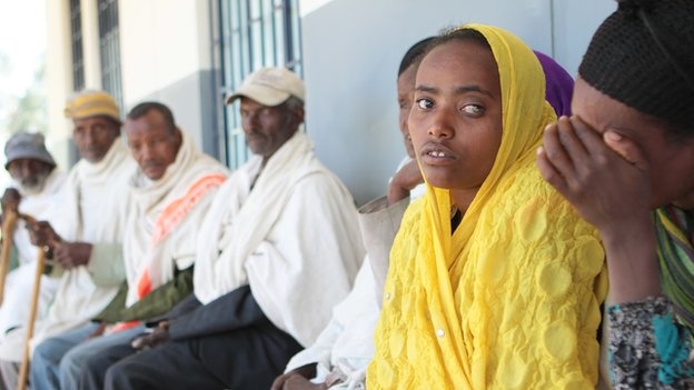 Người dân trong làng Kuyu, vùng Oromia, Ethiopia ngồi đợi đến lượt khám mắt. Gần nửa số dân tại Kuyu đau mắt hột, chứng truyền nhiễm gây mù cao nhất trên thế giới. Đau mắt hột thường bắt đầu ở trẻ nhỏ. Nếu người bệnh không điều trị kịp thời, vi khuẩn sẽ gây viêm. Chỗ viêm sau đó thành sẹo dưới mí mắt, đẩy mí mắt hướng vào phía trong khiến lông mi đâm vào giác mạc, gây cảm giác đau đớn. Ảnh: BBC.
