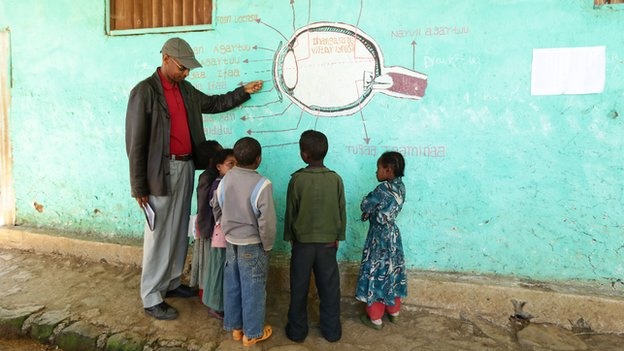 Nhân viên y tế giáo dục trẻ về chứng đau mắt hột. Tiến sĩ Wondu Alemayehu, bác sĩ nhãn khoa hàng đầu ở Ethiopia, cho biết, bệnh nhân đau mắt hột có thể khỏi bệnh sau một ca phẫu phuật 10 phút. Phụ nữ có nguy cơ mắc bệnh cao gấp hai lần so với nam giới vì họ tiếp xúc với trẻ đau mắt hột nhiều hợn. Chỉ tính riêng ở Oromia, 200.000 người đang đứng trước nguy cơ mù nếu không phẫu thuật. Ảnh: BBC.