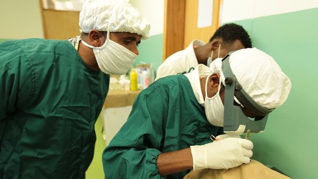 Nhân viên y tế đang học thao tác phẫu thuật mắt. Tiến sĩ Wondu Alemayehu đã đào tạo một nhóm nhân viên y tế địa phương để họ có thể phẫu thuật cho người dân trong vùng. Ảnh: BBC.