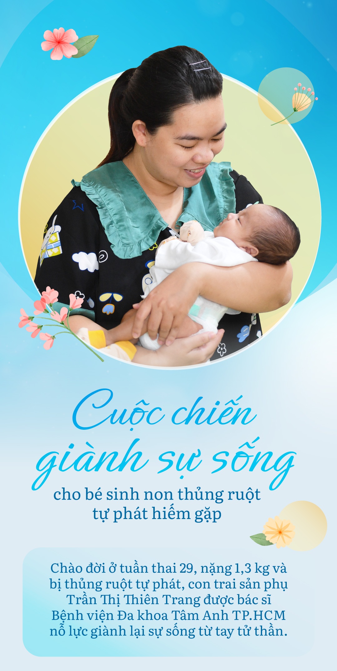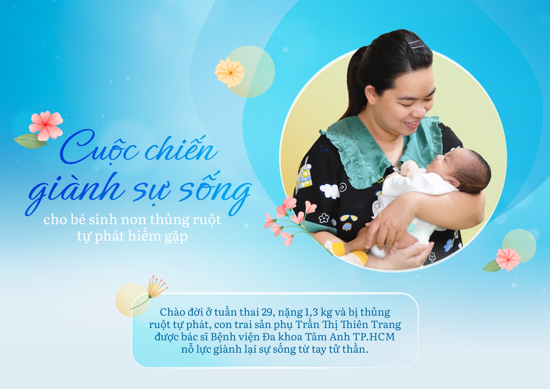 Tại Trung tâm Sơ sinh Bệnh viện Đa khoa (BVĐK) Tâm Anh TP.HCM, TS.BS Đỗ Hữu Thiều Chương - Phó giám đốc Trung tâm Sơ sinh - đã đồng hành, theo dõi và chăm sóc nhiều trẻ sơ sinh có bệnh lý nặng và phức tạp, nhất là những bé sinh cực non. Trong đó, có bé sinh non đi kèm tình trạng bệnh lý thủng ruột tự phát của sản phụ Trần Thị Thiên Trang (quận Tân Bình, TP.HCM).