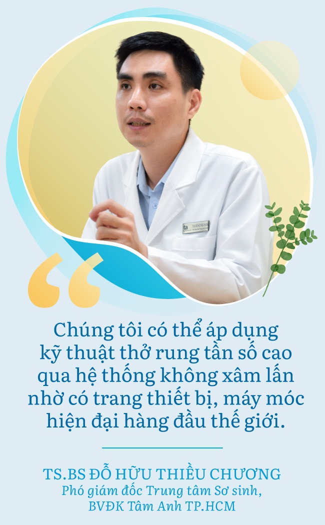 “Xu hướng điều trị trẻ sơ sinh trên thế giới hiện nay là hạn chế xâm lấn. Với trẻ sơ sinh, hỗ trợ thở xâm lấn tức là đặt ống vào khí quản, như vậy sẽ tăng nguy cơ viêm phổi và tổn thương phổi do thở máy. Đó là lý do chúng tôi cho bé thở CPAP không xâm lấn ngay phút đầu sau sinh, giúp phổi không bị xẹp. Trước đây, kỹ thuật thở rung tần số cao chỉ áp dụng xâm lấn qua nội khí quản và dành cho những người tổn thương phổi rất nặng. Nhưng hiện nay, chúng tôi vẫn có thể áp dụng phương pháp này qua hệ thống không xâm lấn nhờ có trang thiết bị, máy móc hiện đại hàng đầu thế giới”, bác sĩ nói thêm.