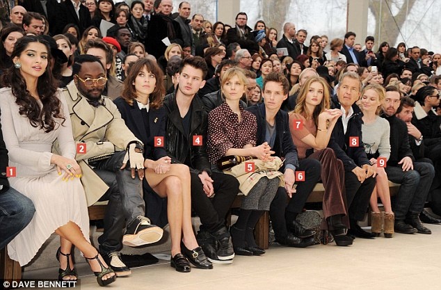 | Một show của Burberry quy tụ nhiều sao như will.i.am, Alexa Chung, Jeremy Irvine, Eddie Redmayne, Kate Bosworth... Ảnh: Dave Bennet |