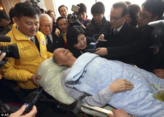 | Giới chức Hội Chữ thập đỏ giúp ông Kim Sun-kyum, 91 tuổi, tới nơi gặp mặt người thân đang sống ở Triều Tiên dù sức khỏe không tốt năm 2014. Hàng triệu gia đình phải chịu cảnh chia ly trong cuộc Chiến tranh Triều Tiên (1950-1953). Ảnh: AP |
