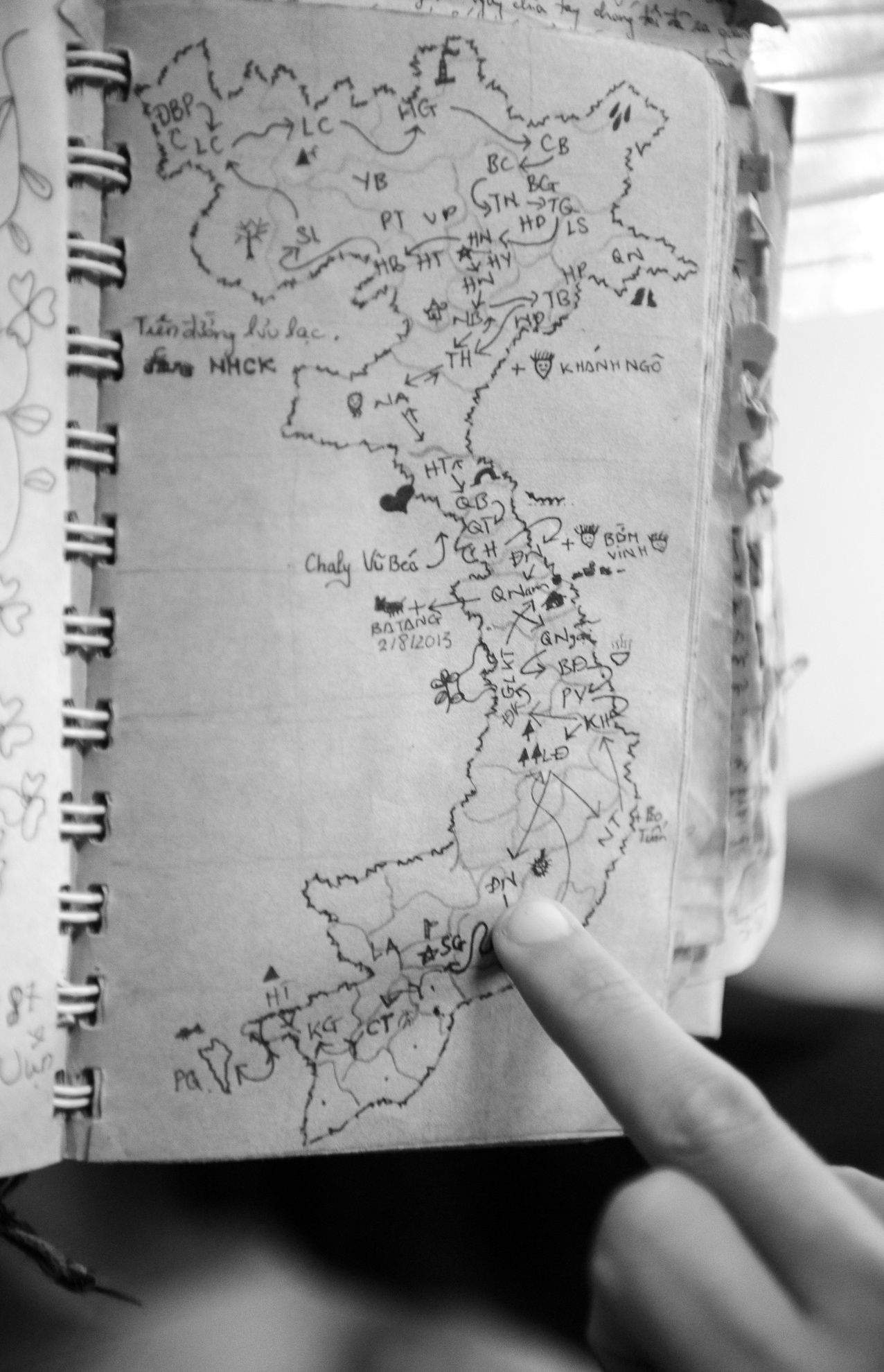 Mỗi ngày, khi không thể tiếp tục lái xe trên các cung đường, Tân lại giở cuốn sổ cũ ghi chép lại những câu chuyện trên đường xuyên Việt, nhớ lại kỷ niệm đẹp cậu đã trải qua. |