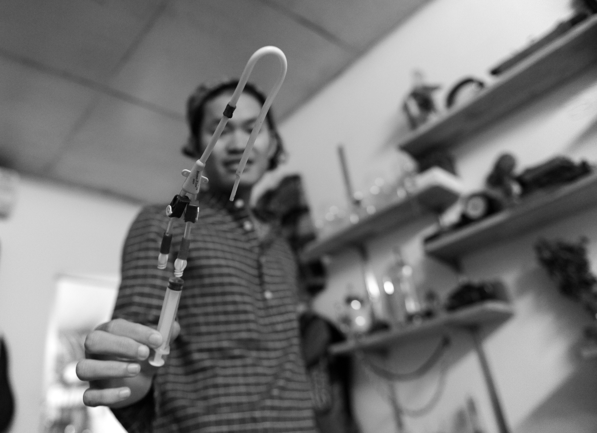 Thời gian đầu, Tân suy sụp và khóc rất nhiều khi không thể chấp nhận thực tế. Cậu phải mang trên mình chiếc ống ngầm lọc máu trong người suốt 4 tháng. |