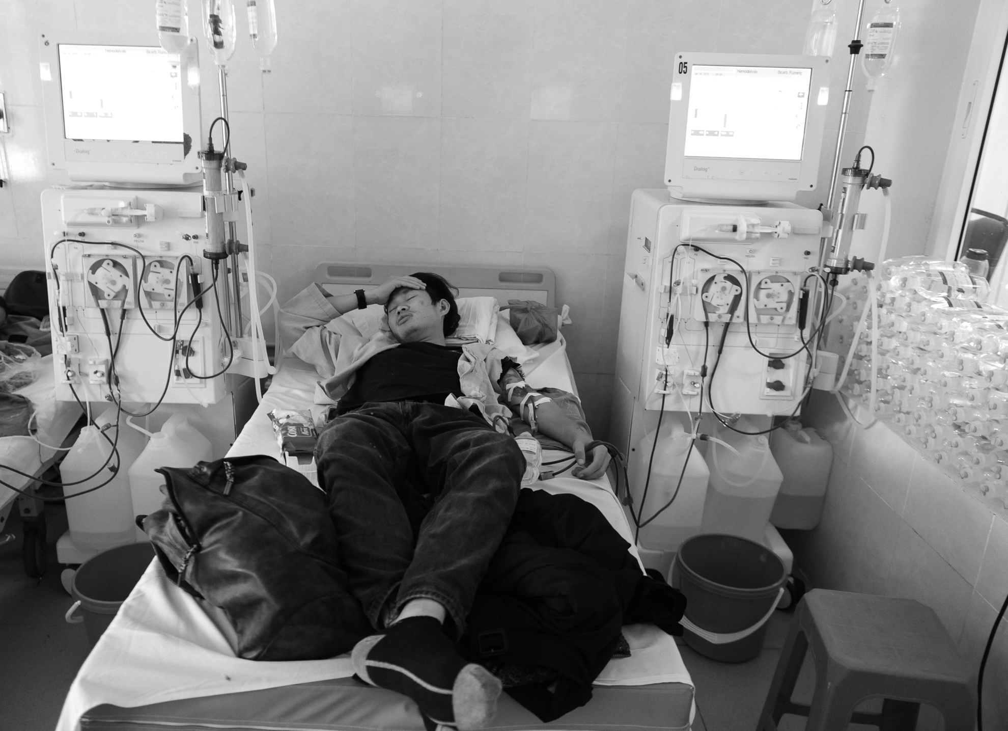 Hai quả thận bị mất chức năng lọc máu. Mỗi ngày, cơ thể cậu tăng lên khoảng 1 kg, mặt mũi phù nề vì trữ nước. Trong đợt Tết dương lịch vừa qua, do bệnh viện nghỉ, không thể lọc máu nên cậu tăng 5 kg. |