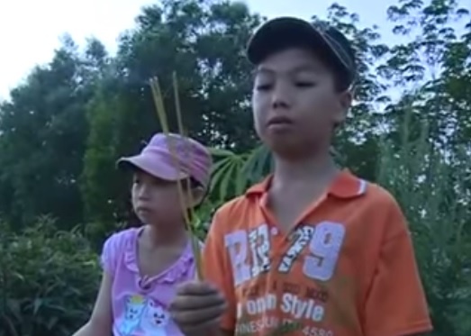 | Như một thói quen, sau khi nhặt ve chai xong, mỗi chiều 2 em đều vào mộ mẹ thắp hương, để vơi đi phần nào nỗi nhớ mong của những đứa trẻ sớm mồ côi. Ảnh: Cắt từ clip |