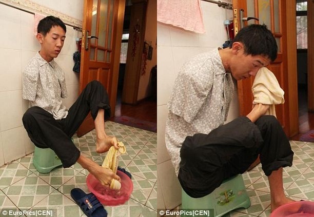| Chàng trai không tay đầy nghị lực Peng Chao. Ảnh: Gmw.cn. |