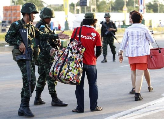Binh sĩ kiểm tra hành lý của những người ủng hộ chính phủ tại thủ đô Bangkok.