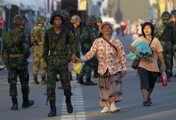 | Lực lượng biểu tình chống chính phủ chuẩn bị rời trại tại Bangkok sau khi quân đội tuyên bố nắm quyền kiểm soát chính phủ. Quân đội Thái yêu cầu đài phát thanh, đài truyền hình ngừng đưa tin như thường lệ và chỉ phát sóng các chương trình của họ. |