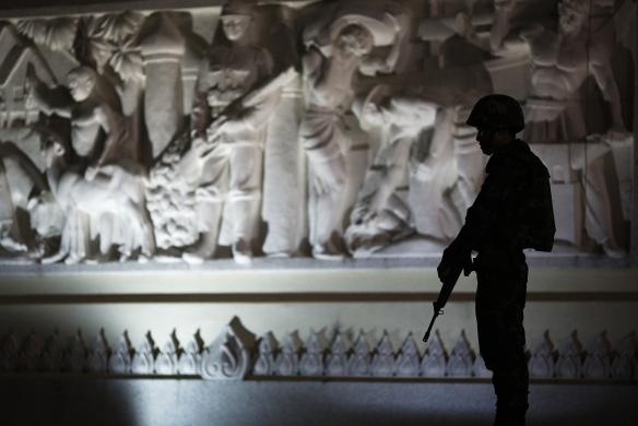 Một binh sĩ canh gác tại tượng đài Dân chủ ở thủ đô của Thái Lan. Lính Thái Lan xuất hiện khắp mọi nơi sau khi quân đội tuyên bố thiết quân luật vào ngày 20/5.