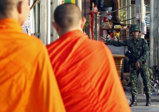 Hai nhà sư đi ngang qua nơi binh sĩ đang canh gác tại tỉnh Nakhon Pathom, ngoại ô Bangkok hôm qua. Các quốc gia Anh, Pháp, Mỹ và các tổ chức trên thế giới bày tỏ sự lo ngại sâu sắc về việc quân đội Thái Lan hôm qua tuyên bố giành quyền kiểm soát chính phủ.