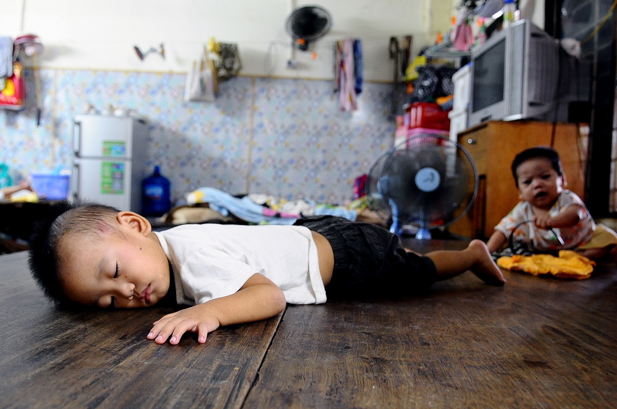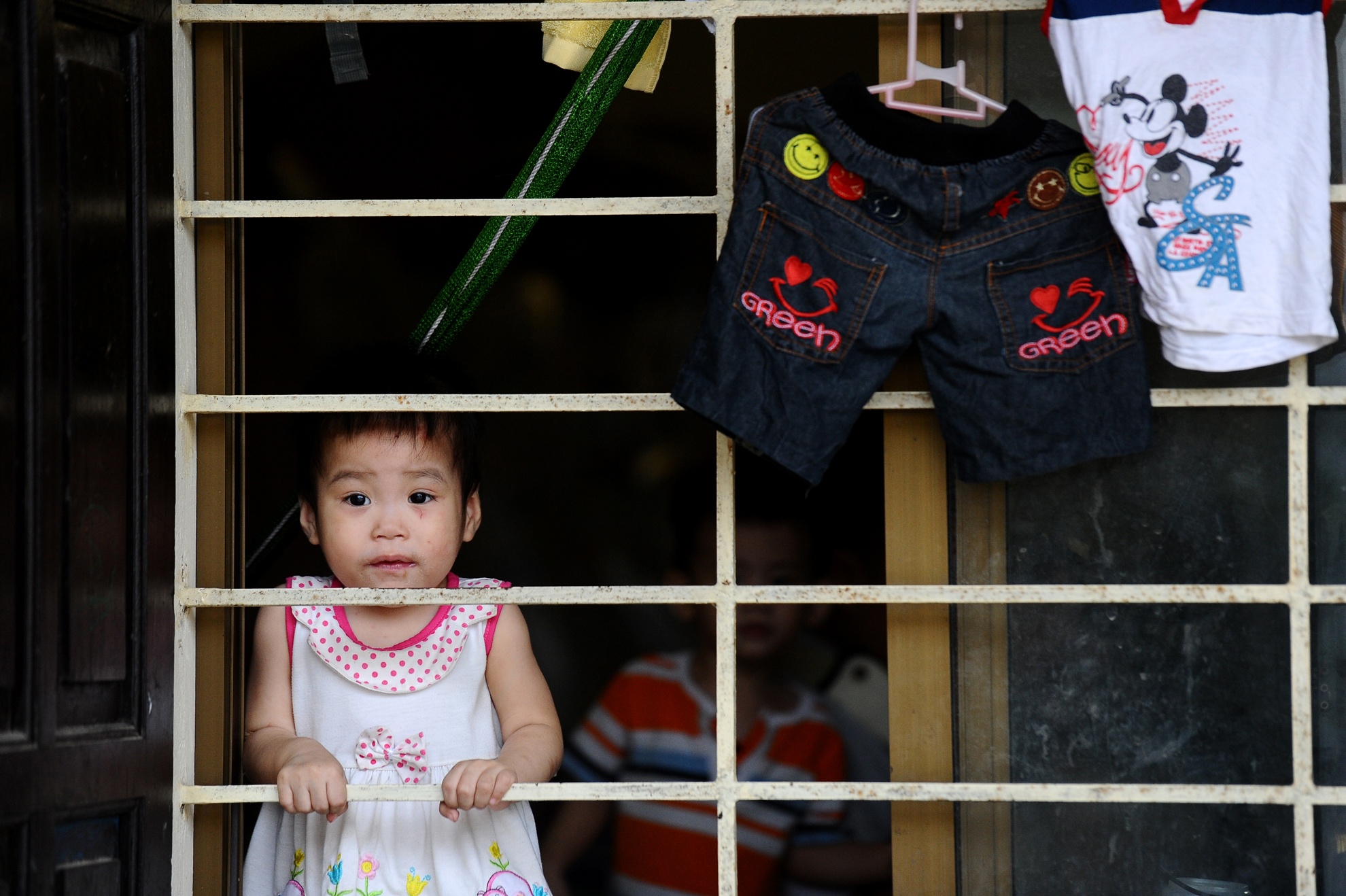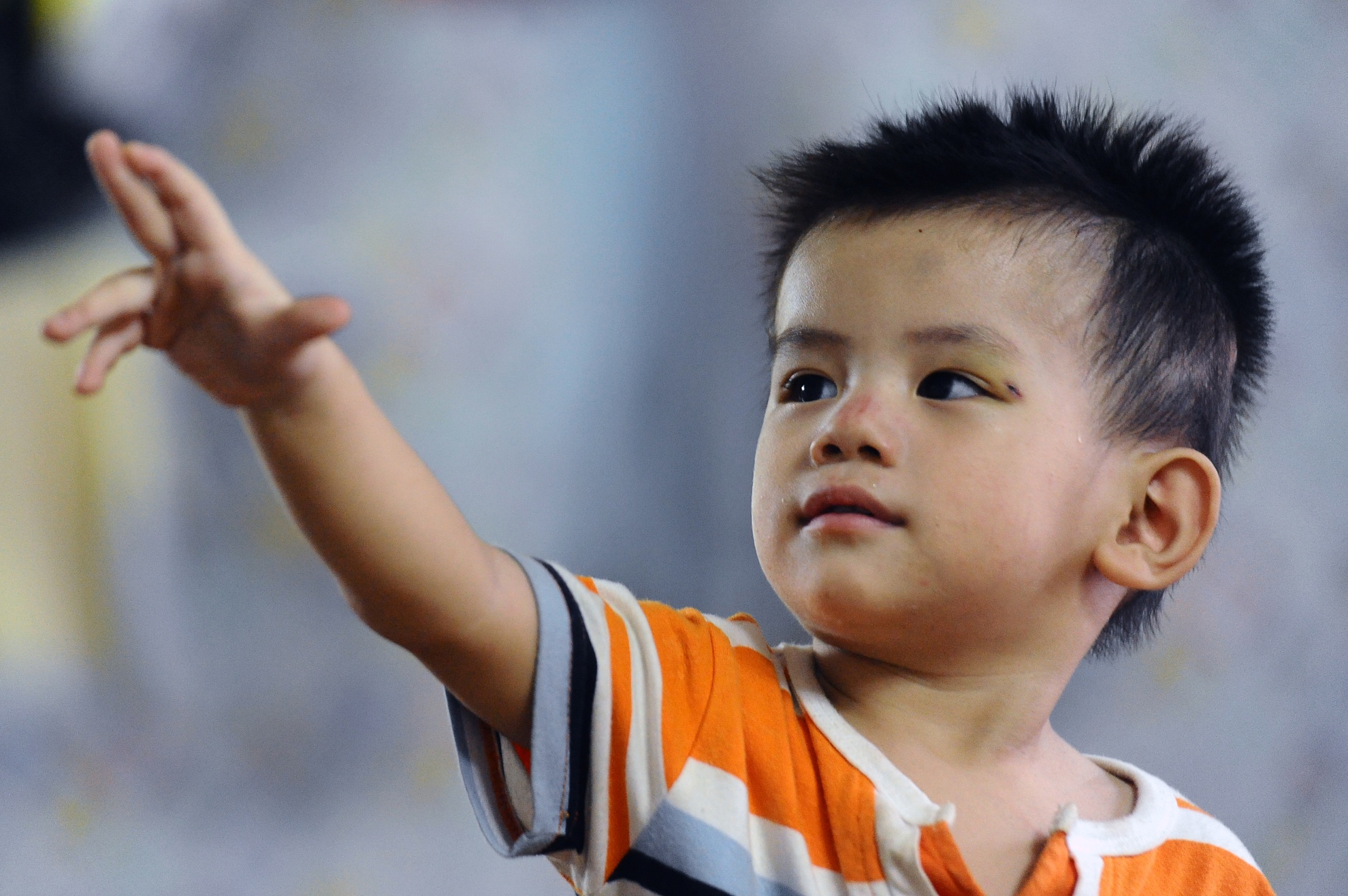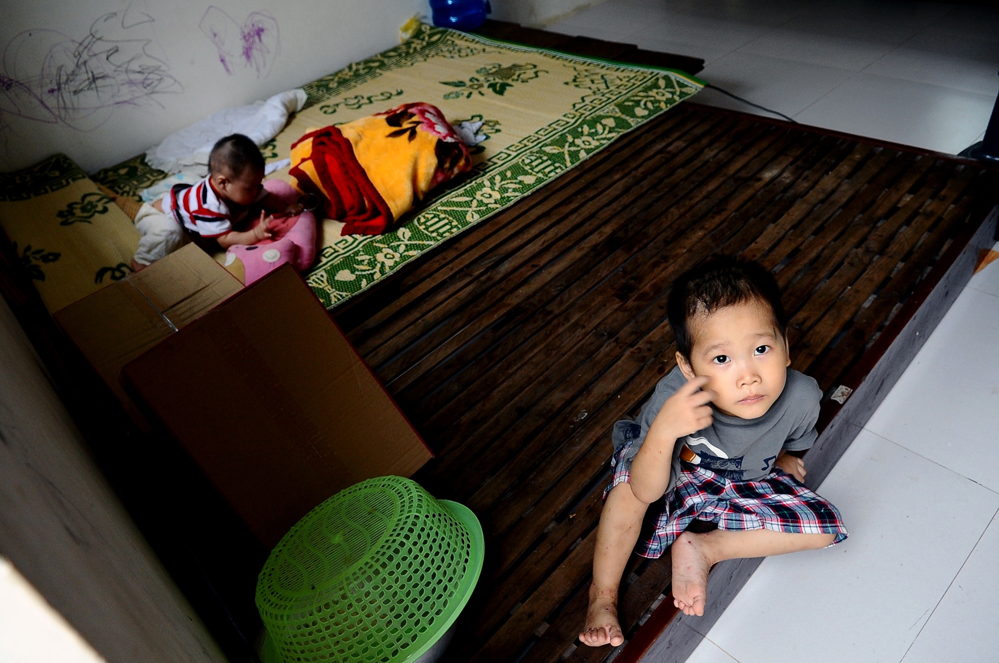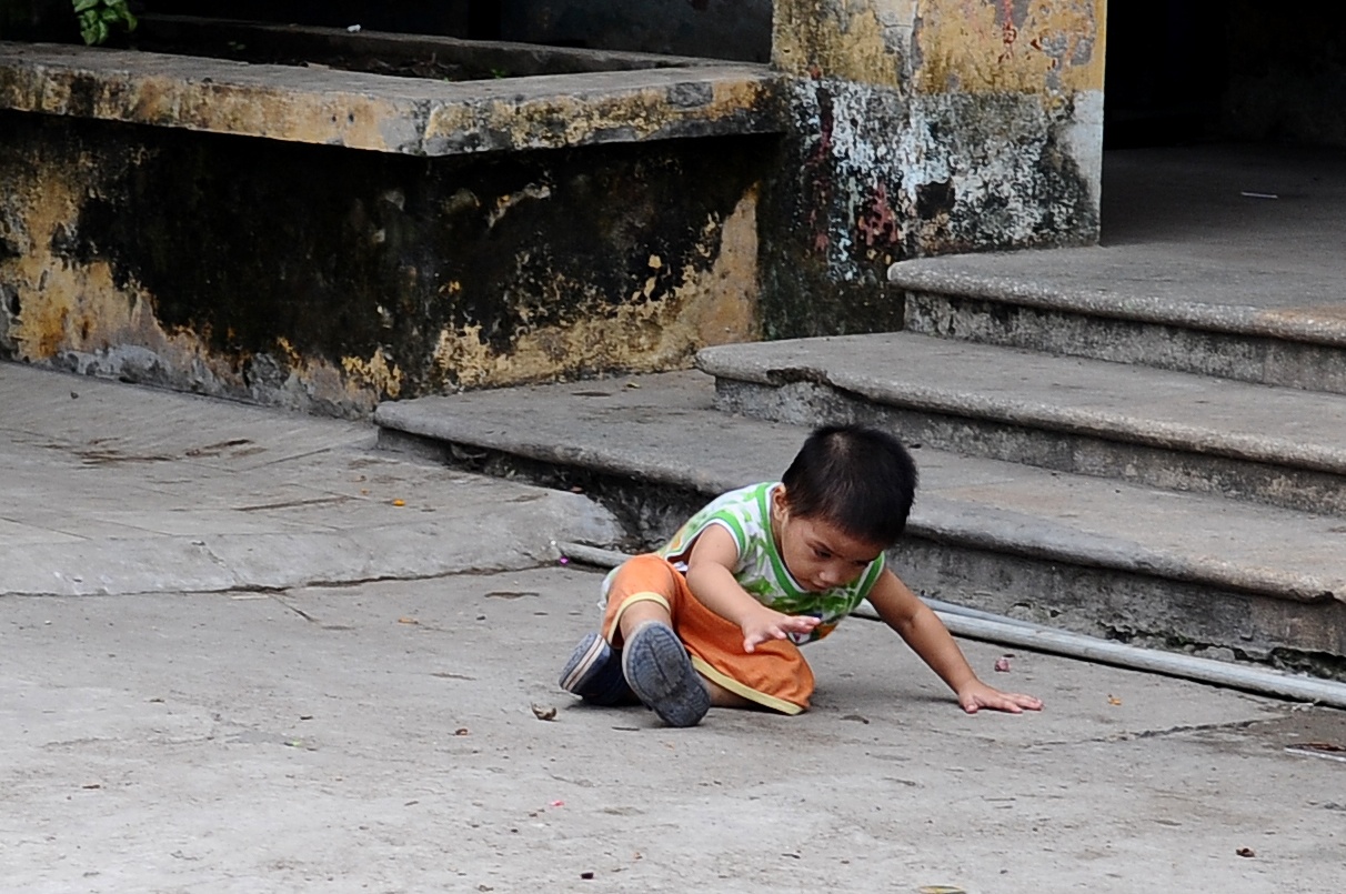 | Lê Anh (3 tuổi) khi được hỏi bố mẹ là ai, cậu chỉ tay bâng quơ về phía sân: "Chỉ có mẹ thôi, bố đi xa chưa về". |